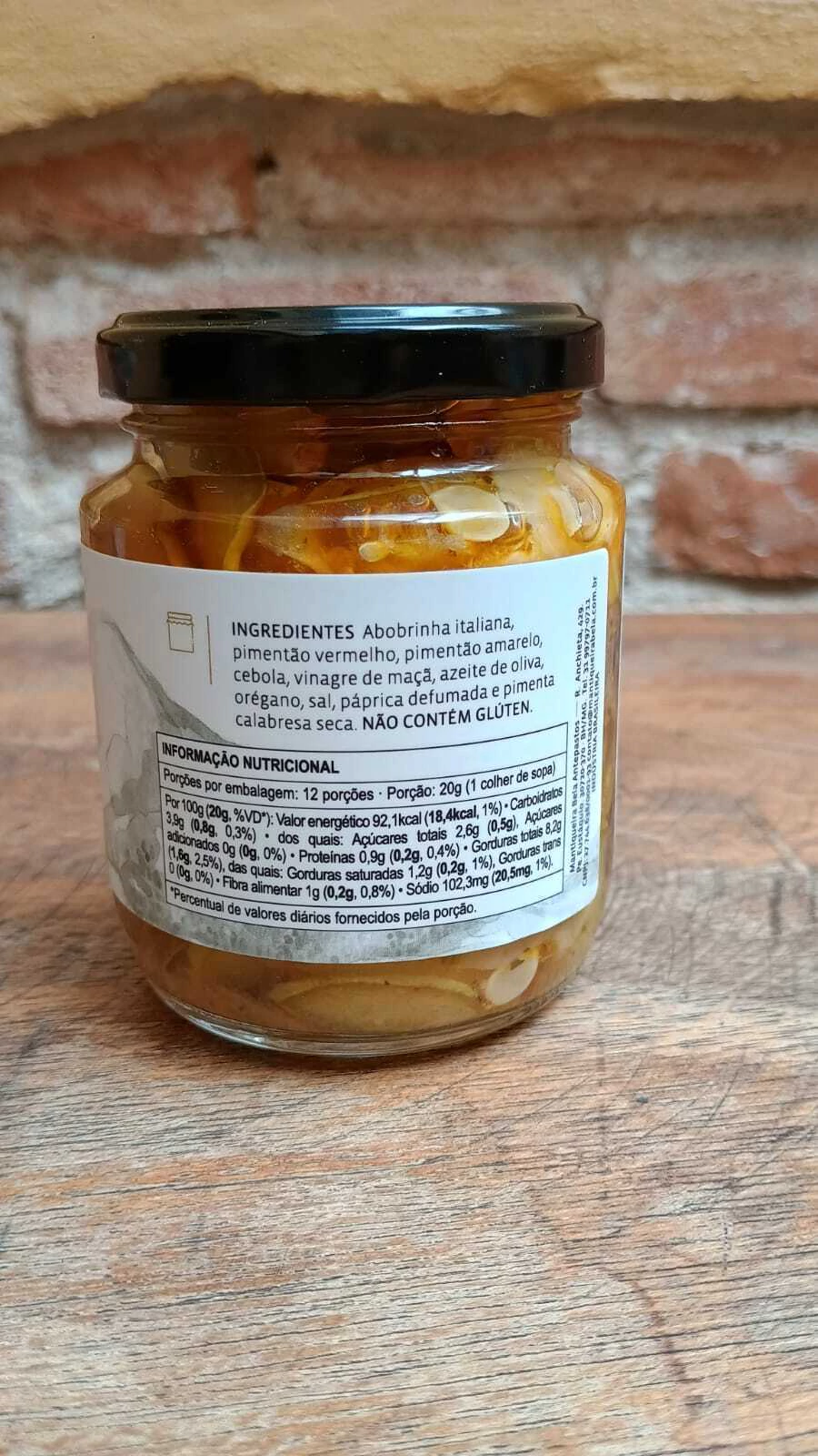Ingredientes: abobrinha italiana, pimentões, sal, cebola, vinagre, azeite, orégano, páprica e pimenta calabresa.