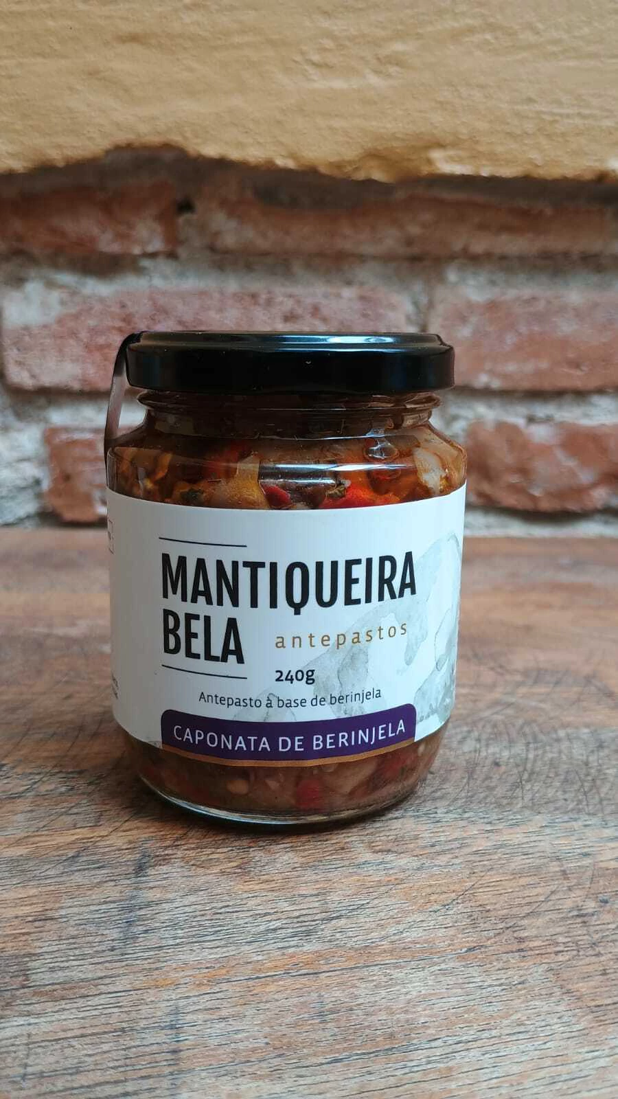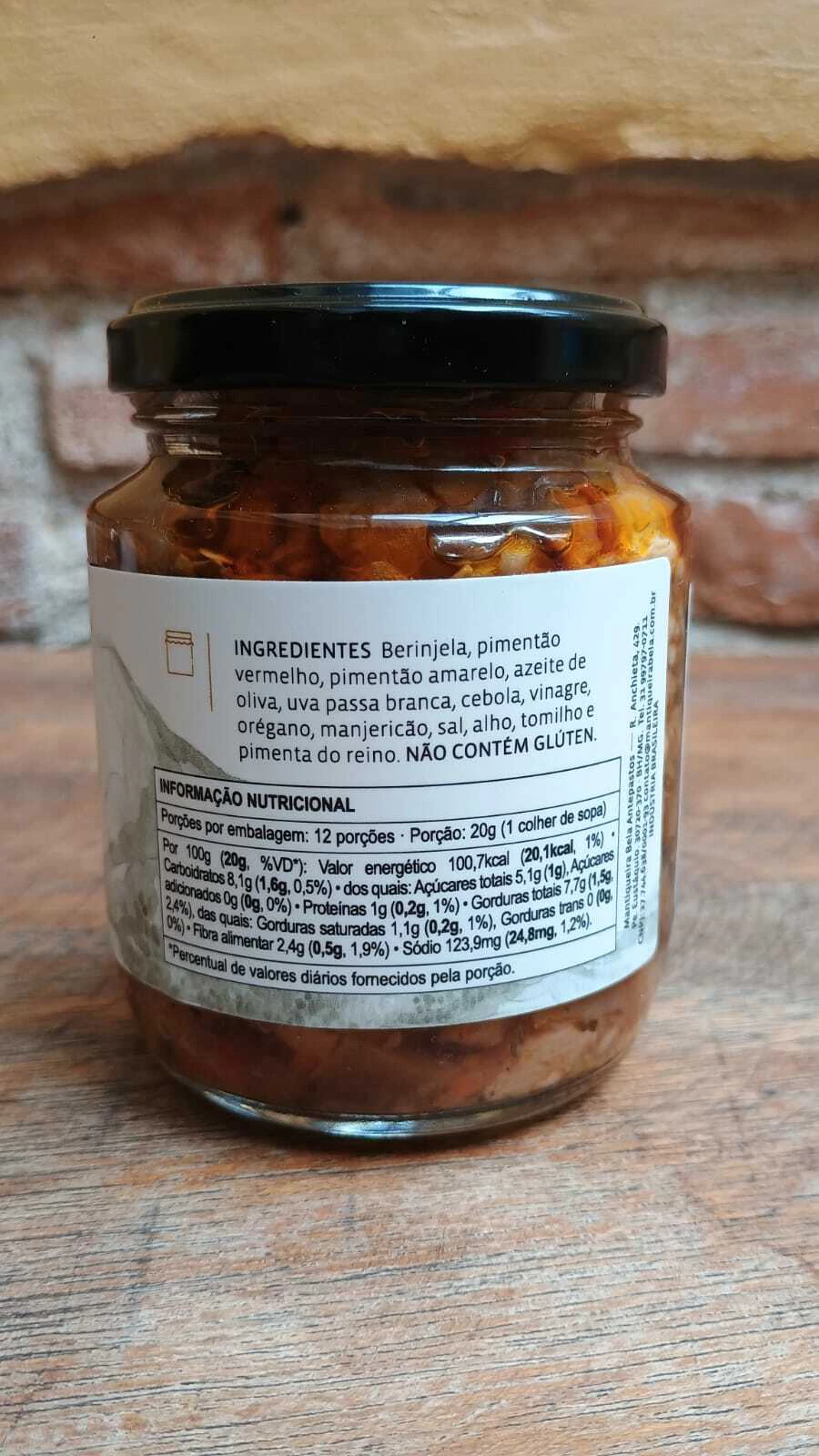 Ingredientes: berinjela, pimentão, sal, azeite extravirgem, uva passa, vinagre, orégano, alho, manjericão, tomilho, cebola e pimenta do reino.